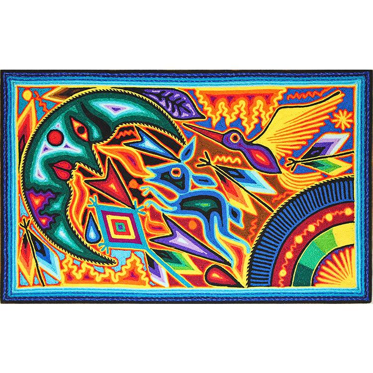 Huichol yarn painting mexican art and crafts that are renowned for its bold designs and bright colors like the sacred yarn paintings or nierika, is made by the huichol. (24 x 24) this 24 x 24 yarn painting is by master artist cresencio perez robles. The yarn paintings are the continuation of a variety of ritual arts long practiced by the huichol with the emergence of this art form beginning in the late 1950s.